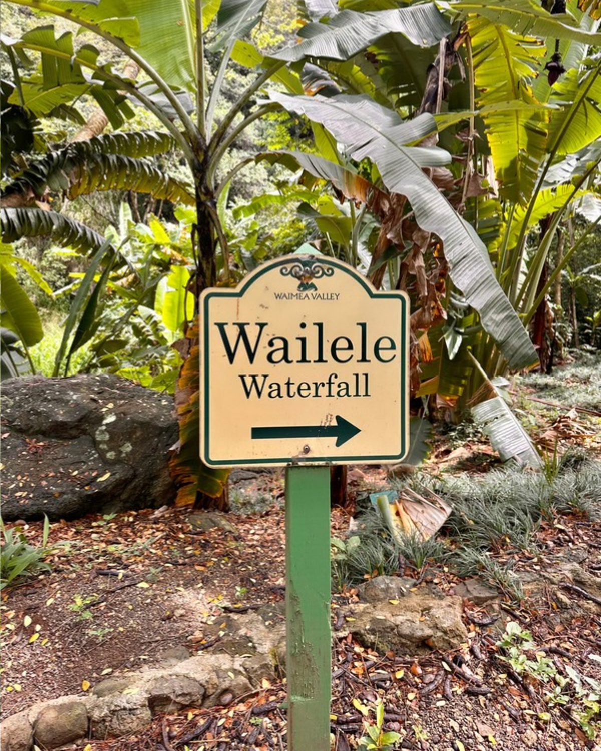 The “trail” is actually a paved walkway that winds through a lush botanical garden in Waimea Valley. You’re surrounded by tropical plants, towering trees, flowers, and interpretive signs explaining the cultural and historical significance of the land.