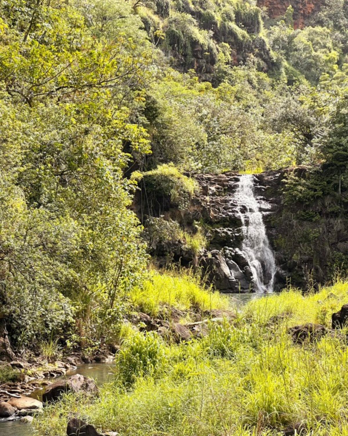 And then you’ll see it — Waimea Falls spilling down a rock wall into a wide, swimmable pool.