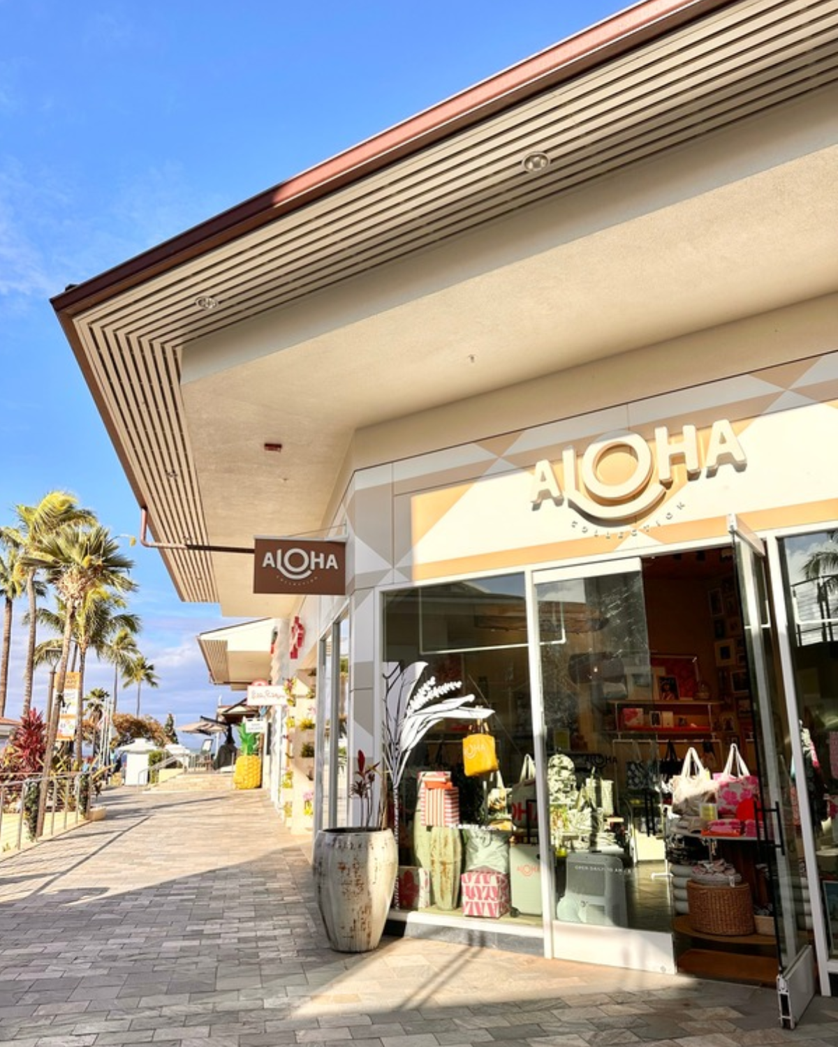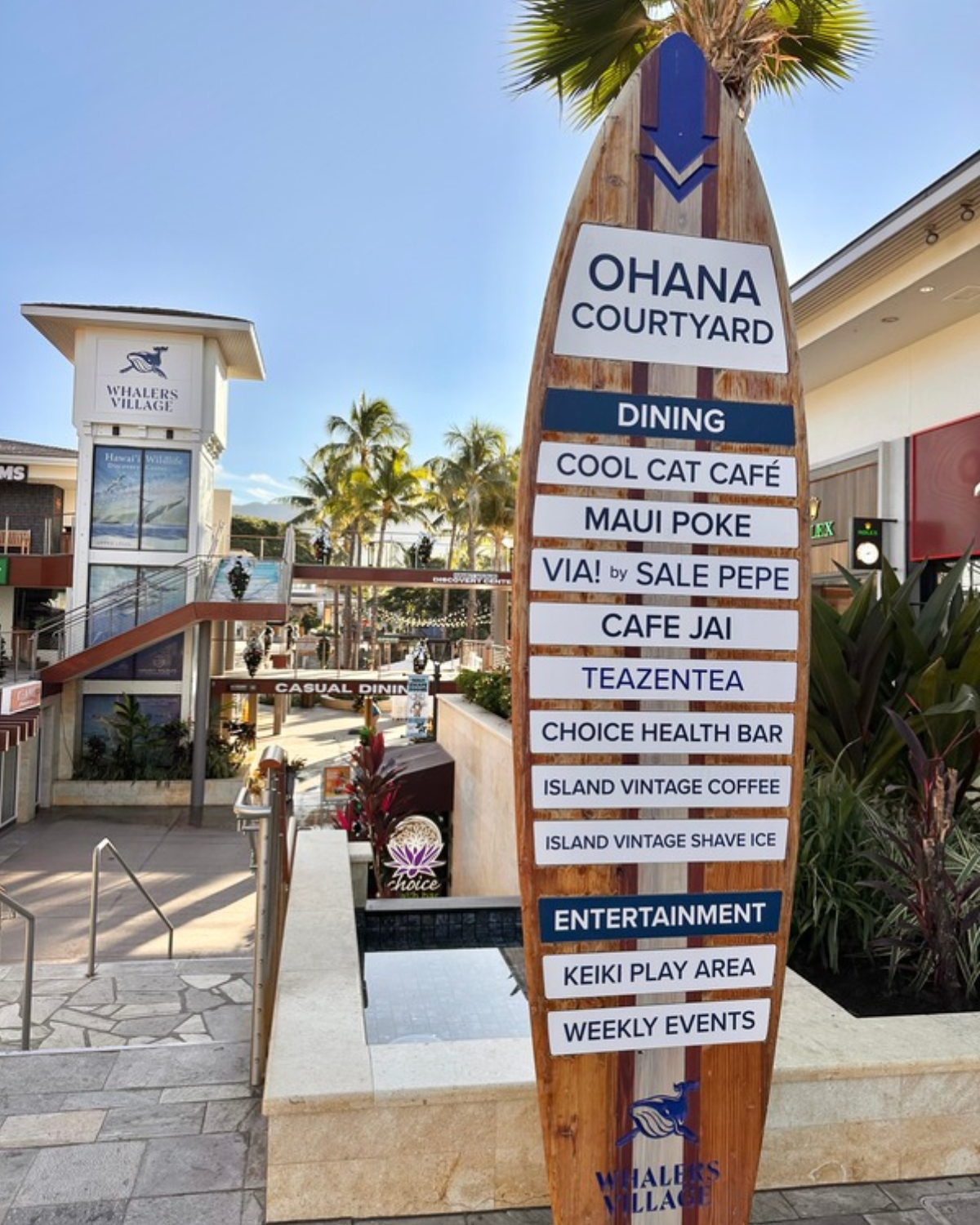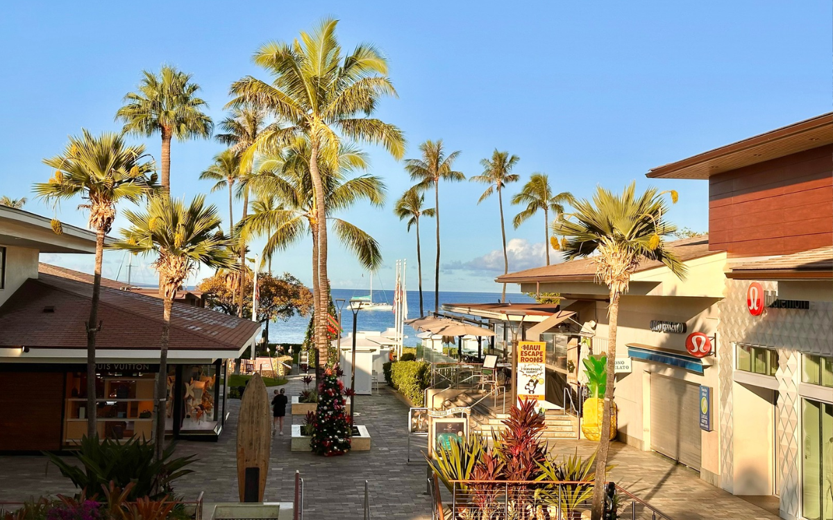 Whalers Village is a beachfront open-air shopping and dining center located right on Ka’anapali Beach on Maui’s west side. It sits along the Ka’anapali Beach Walk and is surrounded by some of the island’s most popular resorts (like the Westin, Sheraton, Hyatt, and Marriott Vacation Club), which means if you’re staying nearby, you can literally walk over whenever you feel like it.